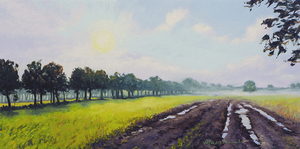 2021Zo'n ochtend in oktober met laaghangende nevel, ik was op de fiets en raakte geïnspireerd door dit landschap. De plassen geven het werk extra diepte.